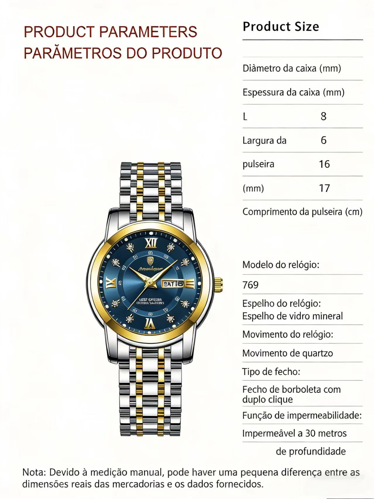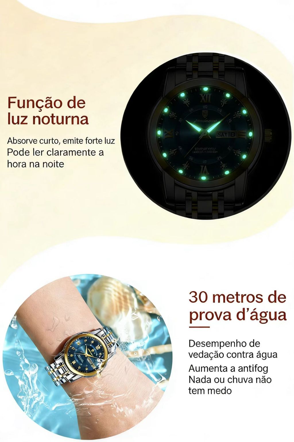 - Visão Noturna: Ponteiros luminosos que brilham no escuro. Praticidade em qualquer hora. 🌙